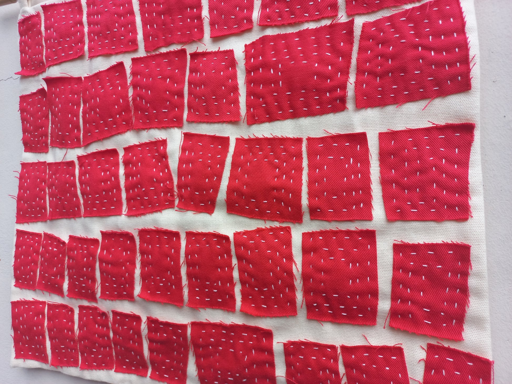 Delicate handstitches on fire red cotton